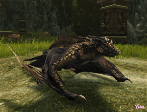 Inferno is a level 38 dungeon rare Raptor dragon located within Gaesis' Roost in Laedis. He will spawn during the cutscene that takes place at the camp. If he has spawned, the cutsene will show 6 dragons moving towards the camp instead of the regular 5 dragons.